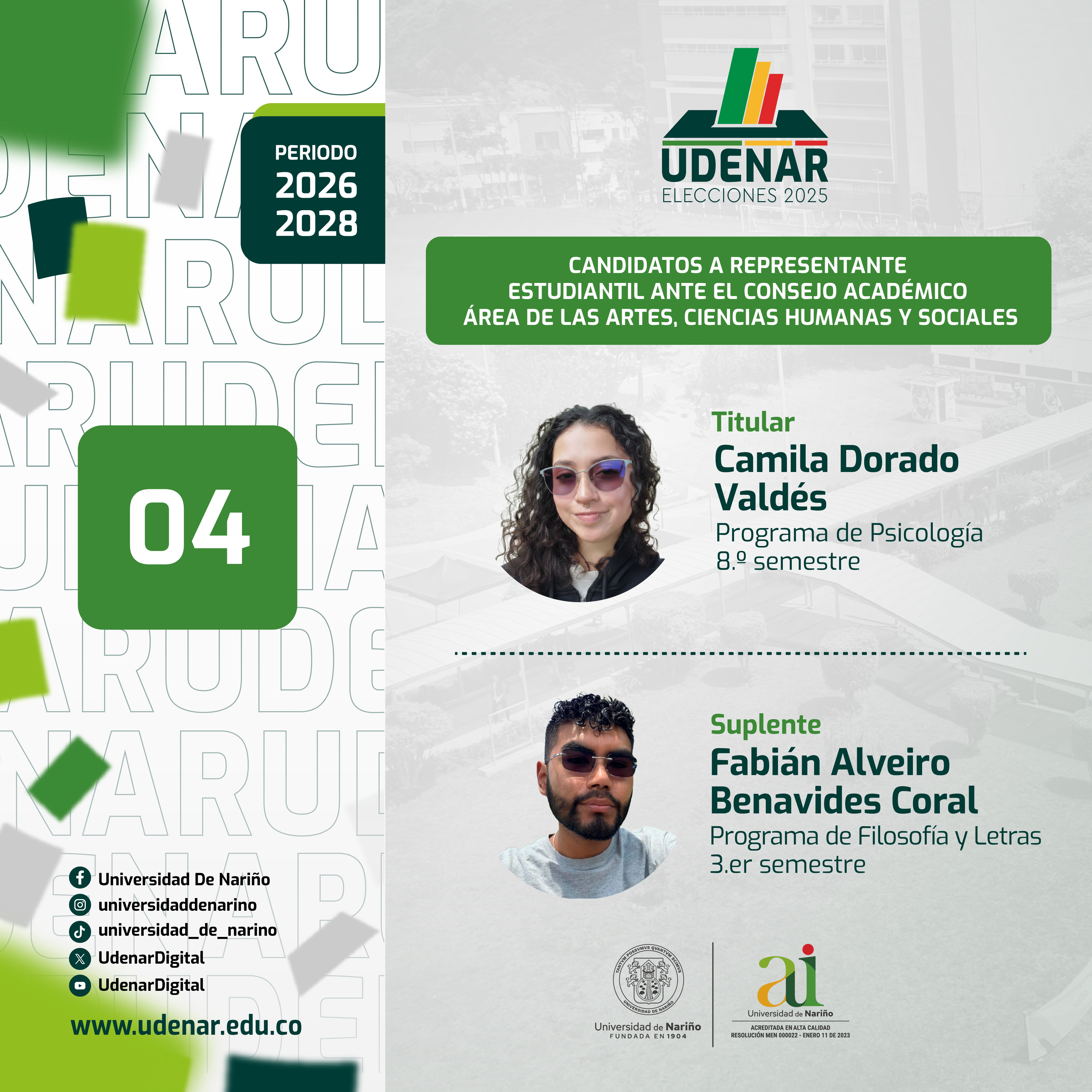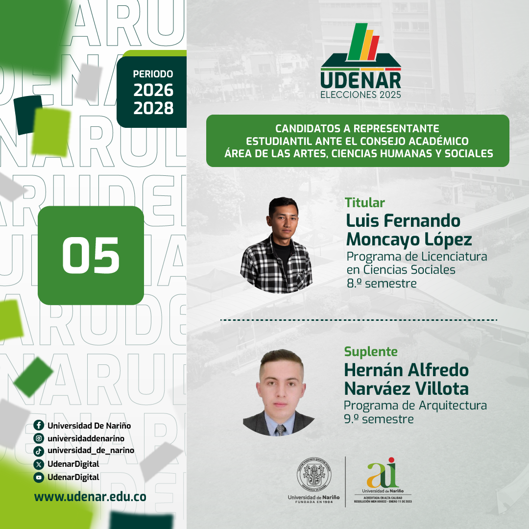 Inicio Elecciones Candidatos Consejo Académico Elecciones Candidatos Consejo Académico Área de las Artes, las Ciencias Sociales y Humanas Por Udenar Periódico Principal - 8 octubre, 2025 21 0 Compartir en Facebook Compartir en Twitter CANDIDATOS A REPRESENTANTES ESTUDIANTILES Ante el Consejo Académico Área de las Artes, las Ciencias Sociales y Humanas Tarjeton #04 Tarjeton #05 Artículo relacionadosMás del autor Candidatos Consejo Académico Seccionales Candidatos Consejo Académico Seccionales Comunicado Institucional Comentarios de Facebook COLUMNISTASUdenar Periódico1498 MENSAJES0 Comentarioshttp://periodico.udenar.edu.co/Oficina de Prensa Universidad de Nariño152 MENSAJES0 ComentariosEditorial Universidad de Nariño82 MENSAJES0 Comentarioshttps://editorial.udenar.edu.co/Hilbert Blanco-Álvarez77 MENSAJES0 ComentariosJulián Sabogal Tamayo40 MENSAJES0 ComentariosSonia Patricia Erazo Coral32 MENSAJES0 Comentarioshttps://periodico.udenar.edu.co/Mariano Sierra24 MENSAJES0 ComentariosGerardo León Guerrero Vinueza18 MENSAJES0 ComentariosInforme de Gestión UDENAR16 MENSAJES0 ComentariosComisión de equidad de género - Udenar16 MENSAJES0 ComentariosJesús Alirio Bastidas13 MENSAJES0 ComentariosAlberto Quijano Vodniza12 MENSAJES0 ComentariosJavier Rodrizalez11 MENSAJES0 ComentariosLorena Mesias10 MENSAJES0 ComentariosRicardo Oviedo9 MENSAJES0 ComentariosReforma Universitaria8 MENSAJES0 ComentariosUniversidad de Nariño Ipiales7 MENSAJES0 ComentariosCarlos Ferreyra7 MENSAJES0 ComentariosIvan Felipe Benavides M.7 MENSAJES0 ComentariosRonald A. Fernández Gómez5 MENSAJES0 ComentariosJesús Martínez Betancourt4 MENSAJES0 ComentariosGerardo Mauricio Bravo4 MENSAJES0 ComentariosMario Mejía1 MENSAJES0 ComentariosTecnología en Promoción de la Salud0 MENSAJES0 Comentarios